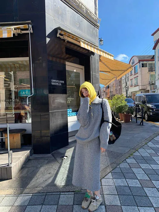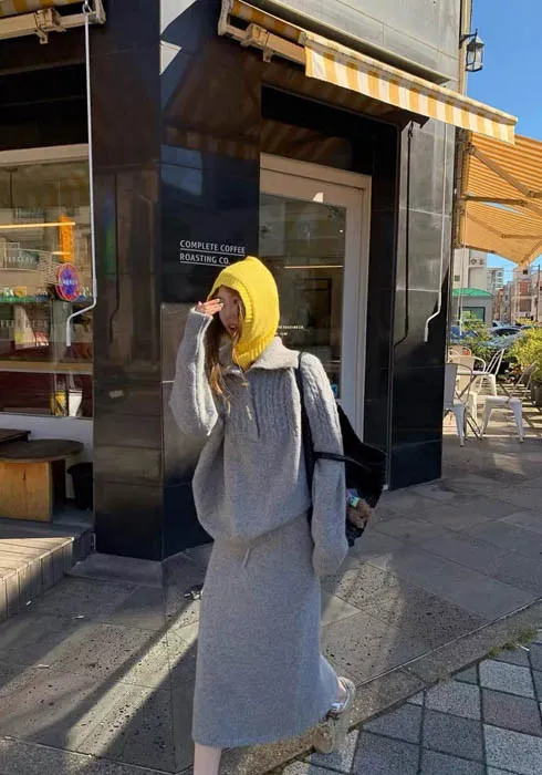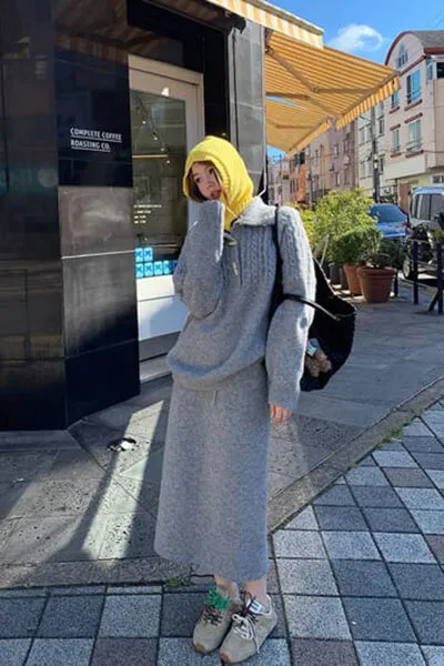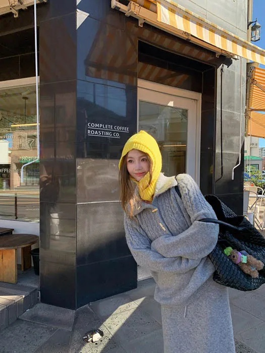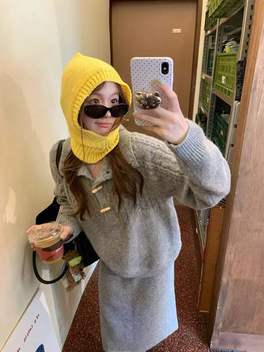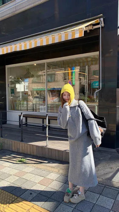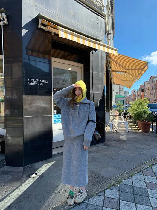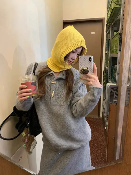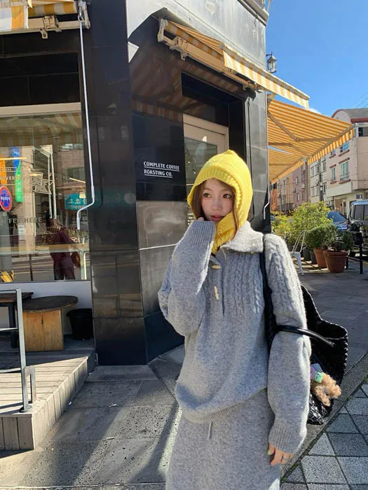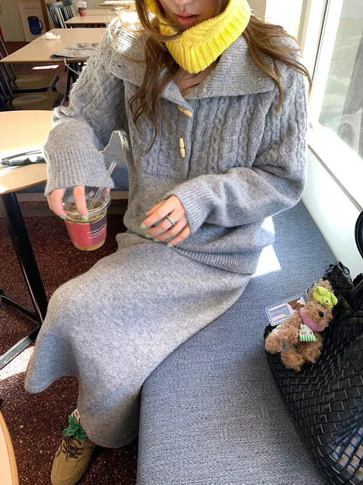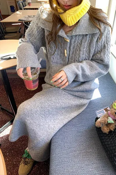 上衣是翻領麻花編織設計
